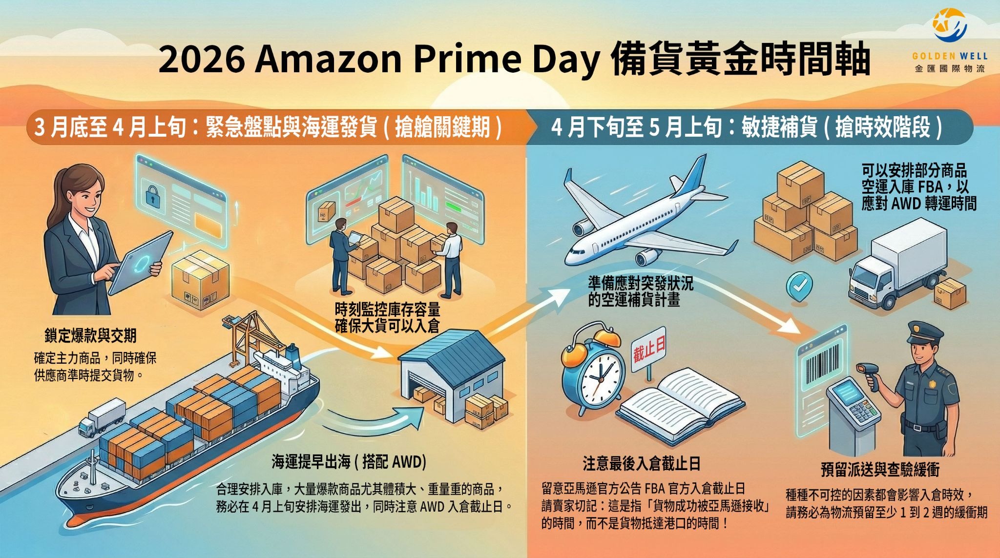 2026 年亞馬遜 Prime Day 戰火提前點燃!隨著官方宣佈活動將提前於6月舉行,且Deal提報窗口已全面開啟(3/24-5/26),台灣跨境賣家們正式進入備貨的黃金倒數期,面對瞬息萬變的航運時效,提早佈局是唯一的致勝關鍵。今天,我們將獨家公開旺季備貨的黃金時間軸,並深度解析如何靈活運用 FBA 及AWD(Amazon Warehousing & Distribution,亞馬遜入倉分銷網路)入倉優勢,結合 Amazon SEND空海運官方頭程物流,將旺季的物流變數轉化為您拉開對手差距的絕對優勢。
