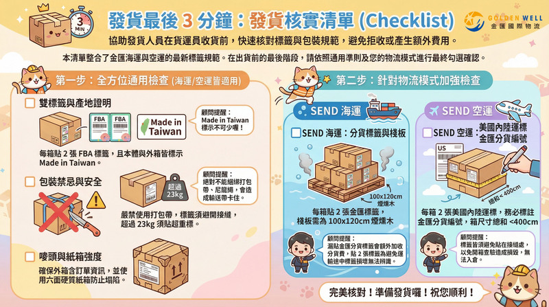 作為 Amazon SEND官方合作夥伴,我們看過太多因為「省小錢」而虧大錢的案例。今天我們依據最新的 SEND 海/空運預處理規範,整理出 5 個最常見的物理性地雷,並提供金匯專屬的 SOP 檢查清單,助您完美入倉。
