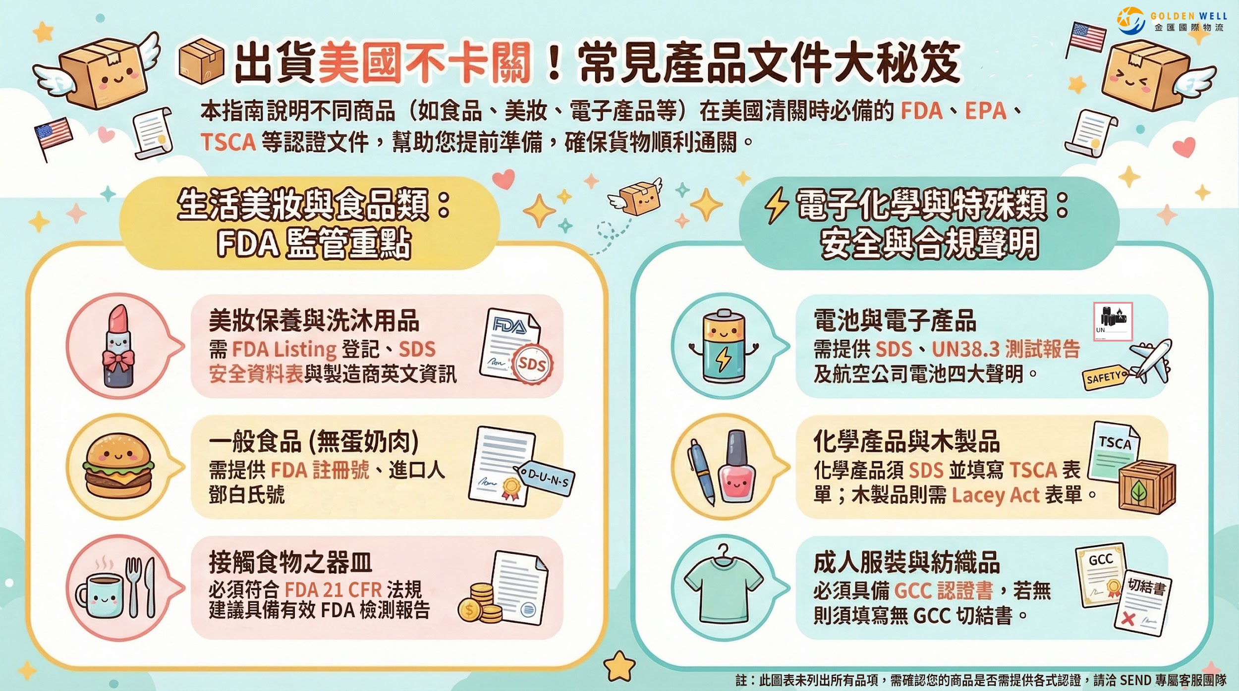 沒問題。這是我們服務的一環。只要告知您的產品類別、成分及照片(如:接觸皮膚的化妝品、車用的燈具、給小孩用的玩具),金匯的顧問團隊會幫您詢問該品類對應的美國監管機構要求(FDA, DOT, CPSC),協助您做準備。