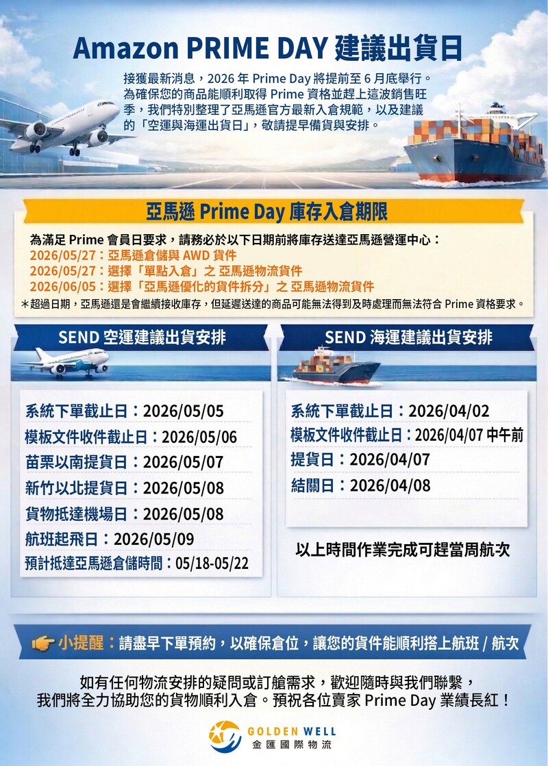 完美的策略搭配精準的執行,就是 Prime Day 成功的方程式!備貨黃金期已經熱烈開跑,為了協助您輕鬆佈局,我們特別將亞馬遜最新入倉規範與 SEND 空海運建議時程,整理成這張一目了然的圖表。只要跟著時間表盡量提早預約發貨,您的優質商品就能穩穩站上 Prime Day 的熱銷舞台,準備迎接訂單爆發的喜悅!